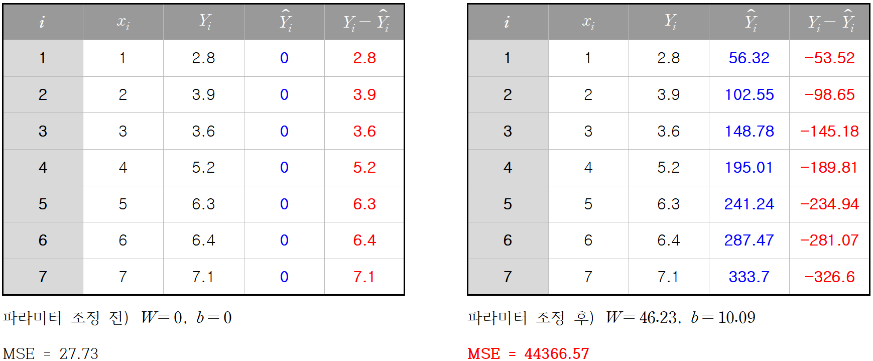 W, b, MSE = 0, 0, 0