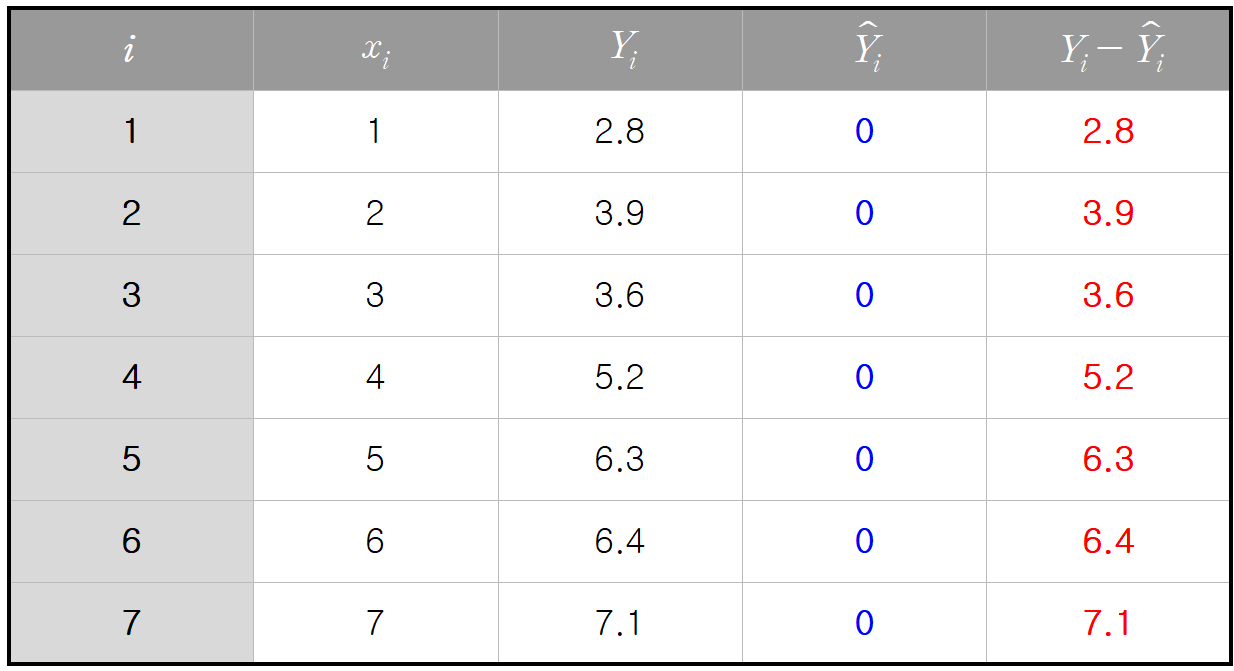 우리는 이 7개의 점들을 가장 잘 대표하는 직선을 찾을 것이다. 일단 직관적으로 우상향하는 직선이 나올 것으로 예상할 수 있지만, 오차를 최소화하는 가중치(